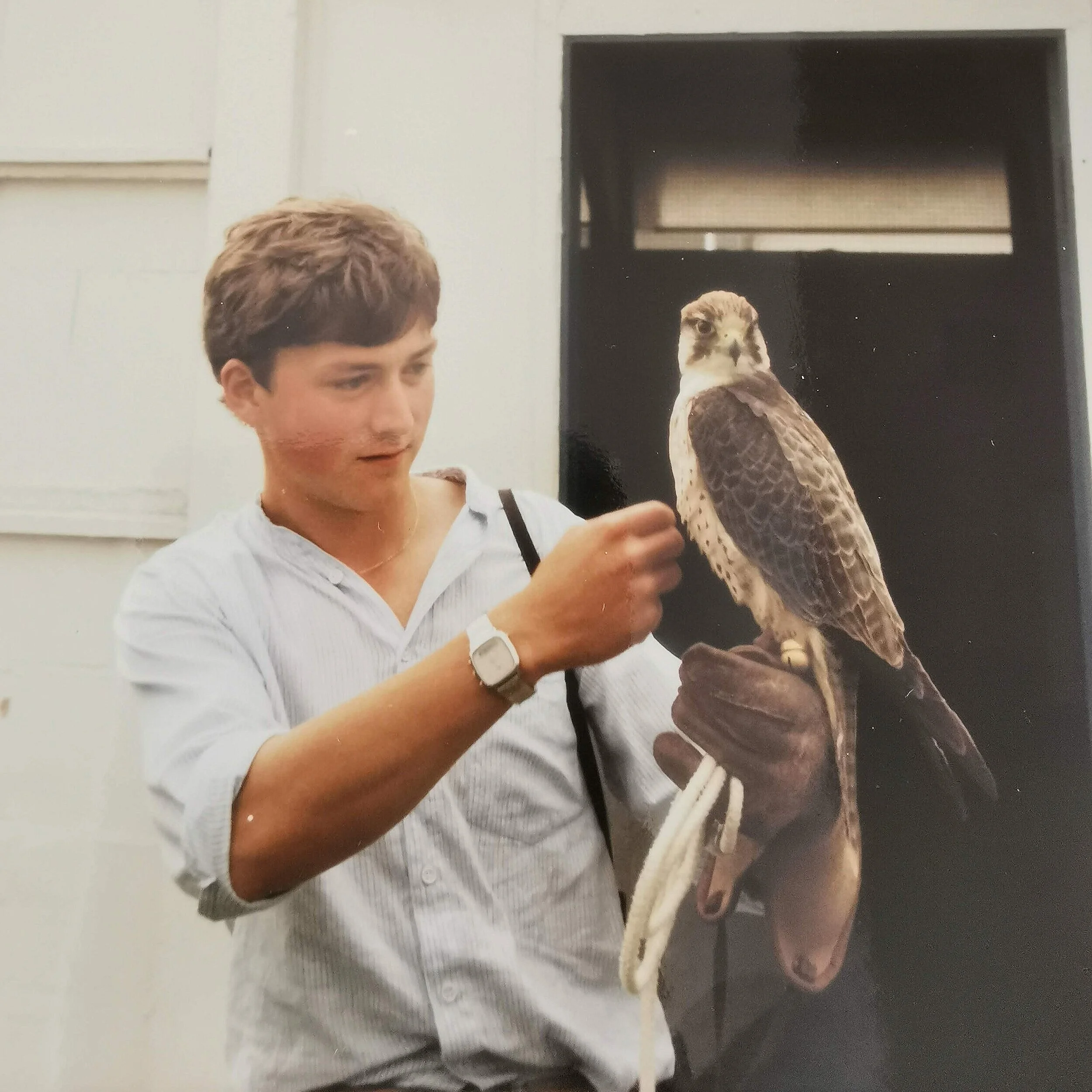 A few years later my brother, almost ten years older than me and then in the Royal Navy down south, arranged for me to spend time with the falconers at RNAS Yeovilton’s Bird Control Unit. You can see the awed reverence in my face in this photo taken during that visit!